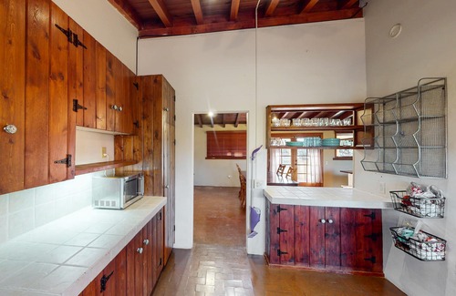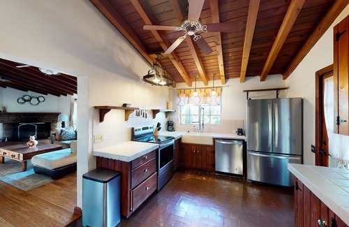 The home features a classic adobe-style design, with brick and saltillo tile flooring, and vigas beam ceilings completing the authentic look. You'll find all the modern home essentials equipped for modern comfort, including a stainless steel full kitchen, central air-conditioning, free WiFi, and a private washer/dryer. A fireplace and plush sectional welcome family gatherings in the main living area, while the den includes a smart TV for streaming entertainment. A private bonus room furnished with a desk can be used as a daytime study space or a home office for remote work needs.