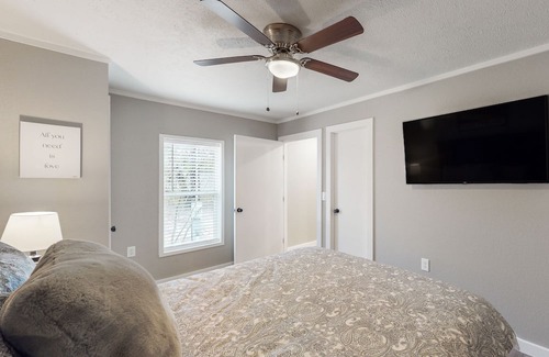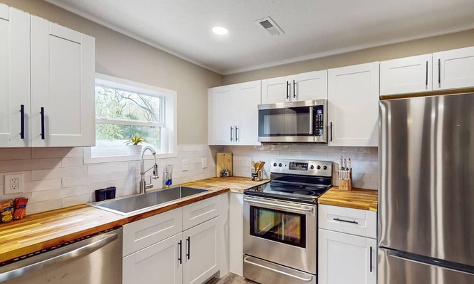 This inviting home away from home treats you to a welcoming open floor plan that seamlessly combines all living spaces into one - ideal for entertaining! Prepare culinary masterpieces in the home's well-appointed kitchen, complete with all stainless steel appliances and a cute coffee corner with a Keurig coffee maker to please coffee enthusiasts in your group. Then, retreat to the living area to lounge and watch an entertaining show or movie on the smart TV with streaming services. Outside, the home enjoys a small wooden deck with a bistró table for two, which is ideal for coffee time or a refreshing beverage in the evenings. Additional perks include a washer/dryer and a gas grill.