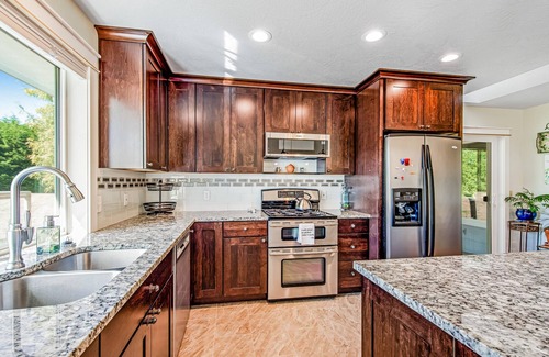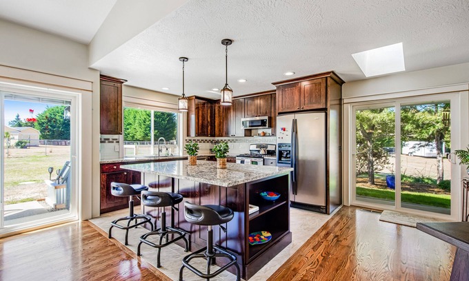 Experience nothing but relaxation at Lavender Dreams, a family-friendly home only two miles away from Port Williams! Gather around the firepit in the large backyard to tell fun or spooky stories. The patio offers a unique saltwater hot tub to treat yourself to soothing baths and a lovely outdoor dining area to enjoy all of your meals alfresco and get some vitamin D from the ever-shining sun. The spacious and light-filled living room is a great place to hang out and rest with your loved ones–the flatscreen TV provides excellent entertainment along with free WiFi and plenty of board games. Whoever gets to be the chef of the group will have a blast in the fully-equipped kitchen! It's conveniently equipped with modern stainless steel appliances, including a French-door fridge, double oven, stove, dishwasher, microwave, and heated tile floors. The gorgeous island provides extra seating for three which adds up to the four-person dining table. This home comes equipped with a convenient mini-fridge and a desk.