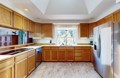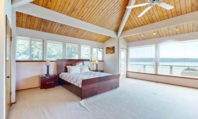 Of the bedrooms, each has its own TV and view of the water, with the upper-level primary suite offering its own balcony. A full-capacity washer/dryer, complimentary WiFi, and a two-car garage are on hand as well.