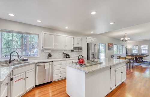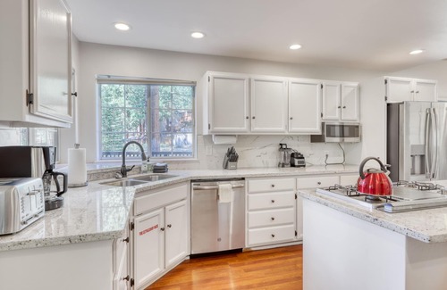 No matter the season, you and your party are sure to have a phenomenal time at this jewel of a home, located just a mile east of beautiful Lake Tahoe! Inside this spacious, two-level vacation rental, you'll find a sparkling chef's kitchen with stainless steel appliances, a gas stove, double wall oven, and a kegerator. Dine together or play board games at one of the indoor or outdoor tables with plenty of seating for your entire group. If it's time for a little friendly competition, rack up the balls and shoot some pool by the gas fireplace while you watch a game on the wall-mounted TV. Or pop up some popcorn and cozy up in the front living room where you can switch on the gas fireplace and watch a movie or a favorite show. This home also includes a private hot tub for the ultimate relaxation. And as for sleeping arrangements, there are six cozy bedrooms here for a grand total of two king-size beds, four queens, and one twin bunk for the kids.