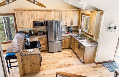 The house's interior is lined with wood paneling to match the natural surroundings. Serve a home-cooked meal prepared in the full kitchen equipped with stainless steel appliances and everything guests who love to cook need. After an active day of non-stop fun, settle into the comfy sofas in the living area and stream your favorite show on the smart TV or cozy up by the fireplace for some friendly conversation. Top it all off with a soak in your private hot tub before bed.