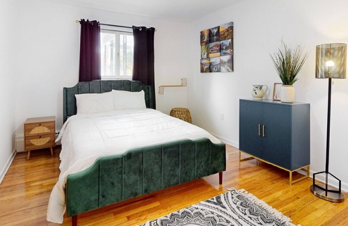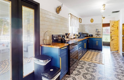 The ground floor boasts a beautifully appointed open floor plan that seamlessly combines all living spaces into one. Unwind in the welcoming living room, featuring gorgeous sofas in front of a wood-burning fireplace and a large smart TV with streaming services to keep you entertained. The chef of the group will have a blast preparing culinary masterpieces in the well-appointed open kitchen, complete with modern appliances. Attached to the kitchen is the laundry area with a washer/dryer. This level also features all four bedrooms.