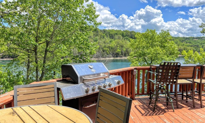 Escape to Lakefront Hideaway in Eureka Springs, AR, where tranquility meets adventure. This spacious house offers two living rooms, including a lower-level space with an extra fridge and a dart board for entertaining evenings with loved ones. Enjoy stunning lake views from the large windows while cozying up by the seasonal fireplace upstairs. The fully furnished kitchen boasts bay window views of Beaver Lake, perfect for preparing meals to enjoy on the patio with scenic views and an electric grill for outdoor cooking.