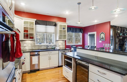 Enjoy the tranquility of a woodland getaway from this welcoming two-story home. Take in the treeline view from the spacious back deck furnished with an outdoor dining table for alfresco meals. You'll have no trouble cooking up something gourmet in the full kitchen equipped with high-end stainless steel appliances, including a double oven and a wall-mount range hood. Your hospitable hosts even provide pantry items, cooking oil, and spices for your convenience.