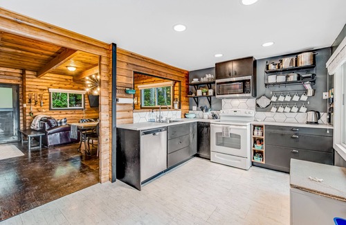 Inside, you'll find an eclectic blend of rustic and modern, creating a real sense of solitude for you and your guests. With the well-equipped, full kitchen and gas grill on the deck, you can prepare that fresh rainbow trout you caught off the private floating dock and then dine together indoors or out. Stoke up the fire in the woodstove in the cozy living area or head outside to gather at the firepit and roast s'mores as the stars emerge. Additional amenities include a private washer/dryer, paddleboat, two kayaks, and a classic clawfoot tub in the bathroom.