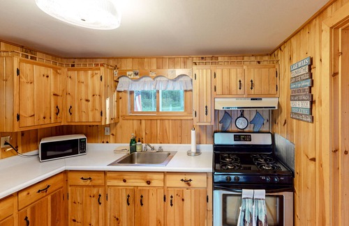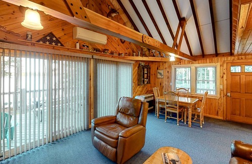 Nestled on the gorgeous waters of Chemo Pond, this cozy cottage is a sure bet for your weekend or week-long getaway. Try your luck at fishing off the small dock or simply enjoy conversation on the large deck. A gas grill is ideal for hosting an afternoon cookout. The kitchen provides all you need to create your favorite recipes. Watch movies on the large TV in the open interior, detailed with vaulted ceilings, rustic decor, and a loft with two beds. A three-person bar in the living area is ideal for sipping a beverage. A full bath and partial air-conditioning add convenience. When you want to explore, find a plethora of outdoor recreation and attractions within a scenic drive!