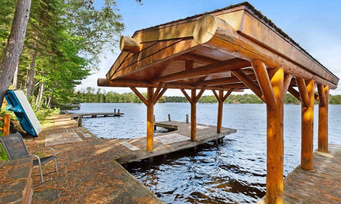 Wake up to the toasty aromas of freshly brewed coffee and head outside to the dock to enjoy the first chirps of the surrounding wildlife. Spend your afternoons playing in the cool waters of Stone Lake, then come home to kick back in the open and expansive living area. You'll love catching up on a favorite mystery novel on one of the comfy couches and watching movies or shows on the enormous wall-mounted flatscreen TV above the wood-burning fireplace. Go for a long walk with the family dog after a satisfying al-fresco meal on the back deck, coming home to relax in the sauna or stargaze with marshmallows and a guitar around the campfire pit. Whether you're here for the fantastic summer activities or the cozy wintertime comforts, Stone Lake has something for everyone!
