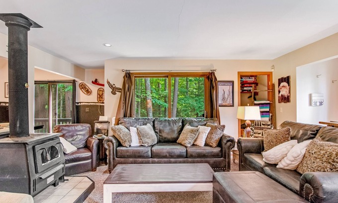 Upon entry, you'll be met with a bright interior and a cozy atmosphere throughout the well-appointed living area. Marvel at the rustic yet modern furnishings blanketed with natural light, radiating comfort from every corner. Relax and make yourself at home by resting on the plush furniture, playing board games together, or curling up by the wood-burning stove with a good book. Prepare grand meals and lake picnic snacks in the open-concept kitchen, equipped with ample cupboard room, a breakfast bar with a breathtaking lake view, and a formal dining table. Comfortable beds in spacious bedrooms ensure everyone receives a wonderful night's rest from the day's adventures, with picturesque forest or lake views from every window. You'll love the huge soaking tub in the main bathroom for relaxation. Please note that this property does not have A/C.
