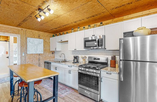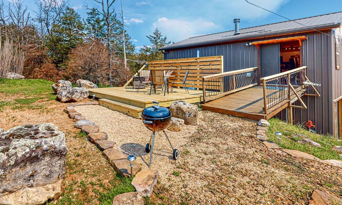 Escape from reality and treat yourself to a wonderful time at this gorgeous studio that sits on the shore of Beaver Lake and is only 10 miles from Eureka Springs! The abode is surrounded by outdoor fun and nearby public lake access. This unique studio is a play on a She-Shed vs Man-Cave. Half of the studio is decorated in a wonderful, playful Damask wallpaper, while the rest of the cabin is left in a rustic tribute to the Man-Cave it once was!