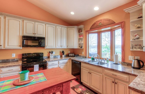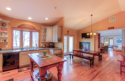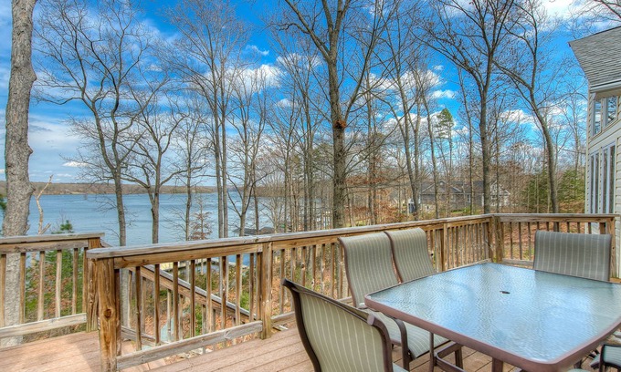 Escape with the entire family to this spacious, lakefront home brimming with deluxe amenities for both relaxation and outdoor fun. Inside, this home features a cozy living area with soaring ceilings, and floor-to-ceiling windows offering incredible lake views. Prepare meals in the full, well-equipped kitchen and then dine together at the adjacent table with bench seating. You'll also find a lower-level family room with an additional TV and another chill-out space with a foosball table. Outside, kick back on the furnished deck and enjoy the view, or head down to the water where you can drop in off the dock in one of the kayaks or head out on a paddleboard.