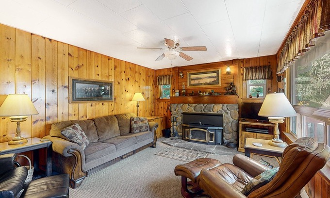 Head inside with ease, thanks to front and rear entrance ramps, and make yourself at home in the open living space. Curl up by the wood-burning fireplace, set up a board game with a movie playing in the background, or get started on dinner in the kitchen. Feel free to use the office space, which includes a small desk, business chair, and additional lighting, to catch up on some remote work. The provided high-speed internet ensures you'll get things done in no time. A private washer/dryer is also on hand for your convenience.