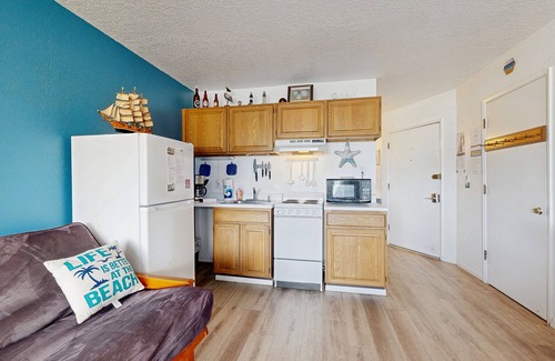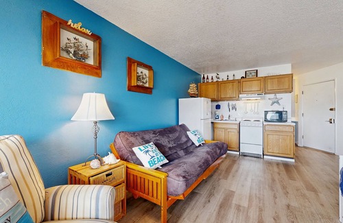 Walk across the building's private bridge and take your dog on a stroll along the beach, or relax on the balcony for an incredible view of Proposal Rock. This comfortable second-floor studio has a queen-size murphy bed and a queen-size futon, along with cable TV, a DVD player, and a huge library of DVDs for your viewing pleasure.