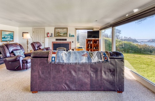 This single-level, bluffside home on the Southern Oregon Coast features private beach access, a furnished patio, incredible ocean and lighthouse views, and plenty of space for up to six guests plus the family dogs.