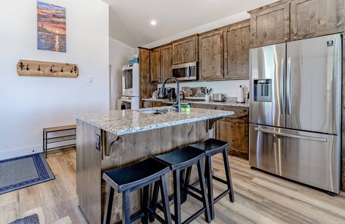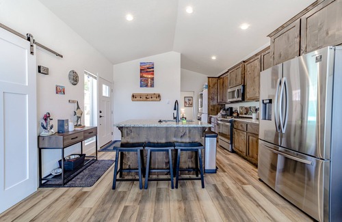 This is a newly built home with beach access right across the highway and amazing ocean views from a large and comfortable deck! Inside, the home enjoys an open concept that includes the living and kitchen areas, so you can keep up on conversation, no matter what room you're in. Spend your days on the beach then come back to spread out in the living room to stream a good movie or show on the wall-mounted flatscreen TV. You'll love using the stainless steel appliances and counter space of the full kitchen to prepare your favorite meals to enjoy at the breakfast bar with seating for three or outside on the deck as an alfresco meal. Use the private gas grill to host a fun summer barbecue with friends. The free WiFi will make it easy to keep your devices connected and with the private washer and dryer, you can even pack light for your trip! Nearby you'll find the Coastal Market, where you can shop for gourmet ingredients and coffee to enjoy out on the deck. There are lots of fun things to explore at places like Gold Beach Books & Art Gallery, Humbug Mountain State Park, Battle Rock Wayside Park, and Jedediah Smith Redwoods State Park, all less than an hour away. When it's time to call it a night, you'll have two well-appointed bedrooms to take advantage of, the primary room with a king-size bed, and the guest room with a queen.