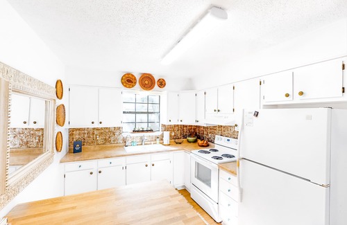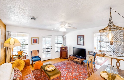 This unique dog-friendly Dripping Springs vacation rental has access to an outdoor entertainment area complete with a shared pool and two hot tubs, as well as an outdoor kitchen, creating a fun experience for a group of girlfriends, a small family, or a group of post-wedding guests. The cottage is a single-level home of quirky taste, with nice hardwood floors and a mix of fun antique furnishings. The living room is on the simple side, making it a wonderful space for guests to relax. Entertainment amenities include WiFi, a DVD player and movie selection to watch on the flatscreen TV (there is no cable), and several board games. Guests traveling with little ones have a Pack N' Play, baby gates, and a high chair to use. The kitchen is an immaculate space with white cabinetry, white appliances, and sand tone countertops (please note that there is no dishwasher). The pressed tin backsplash and cute trinkets add a bit of flair to the culinary experience.