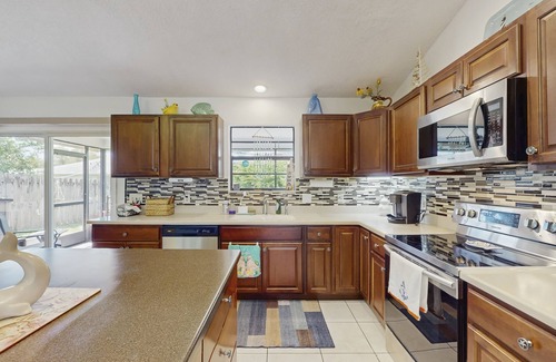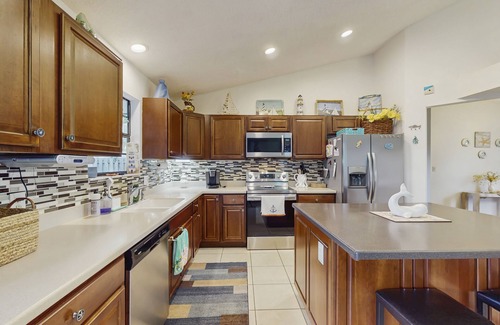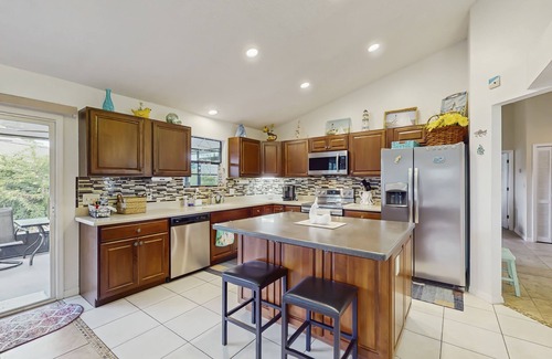 Walking inside your sun-filled retreat, you will instantly take notice of the living room, filled with soft seating, charming nautical decorations, and a large TV. When you aren't dining out, don your chef's hat and head for the fully equipped kitchen. Here, cooking will come naturally amongst the suite of stainless steel appliances, pots, pans and ample meal prep space. Dine easy in the dining room, kitchen island or outside in the screened lanai. In the morning, you can brew your coffee in the comfort of the home with the Keurig or coffee pot.