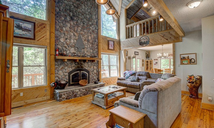 Fill your next North Georgia vacation with the gorgeous sights and sounds of the Tiger River at this lofty riverfront lodge! Hand-crafted by the owner and his children, this beautiful home sits directly alongside a series of waterfalls, offering two wrap-around decks and a firepit with incredible views of the river and falls. Back inside, you'll enjoy the comforts of two fireplaces and a Ping-Pong table for hours of family fun!