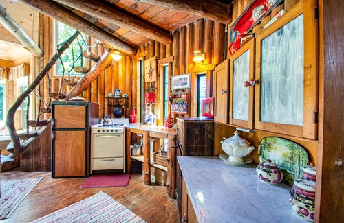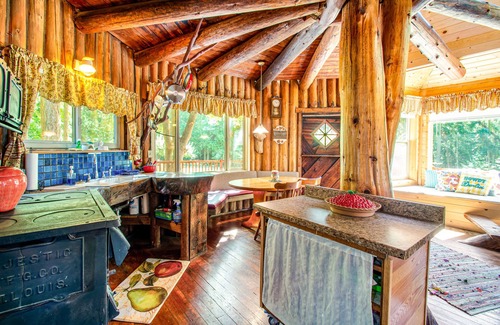 Inside, the cabin is rustic and inviting, full of small nooks where you can curl up with a favorite novel. The kitchen gives you a sense of standing beneath a tree's canopy, with all the essential appliances lining the circular walls. Relax in the dining nook, the window nook, the sunny tower room, or the living room, where you can play cards and charades at night while toasting your toes by the woodstove (with logs provided).