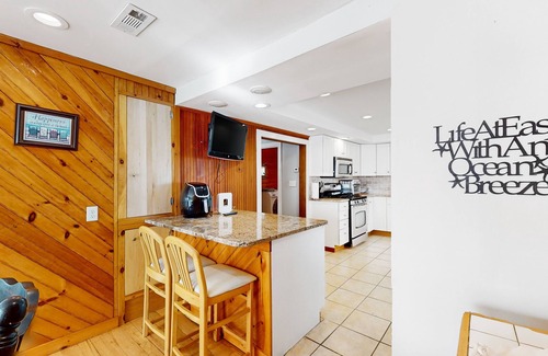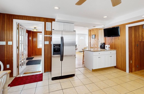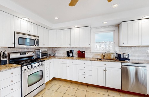 Inside, pure bliss awaits inside the sunlit, open-concept living area featuring comfortable furnishings, tasteful decor with wooden accents, and plenty of room for the group to spread out and unwind. Play board games in the family room, get a little work-from-home done in the dedicated office space, or even sneak in a quick workout using the exercise equipment! The welcoming, eat-in kitchen hosts everything you need to whip up delicious home-cooked meals or quick snacks with ease. As the evening winds down, relax on the spacious deck while savoring some local brews, share laughs, and bask in the cool ocean breeze.