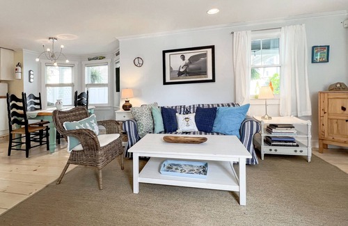 Downstairs is an open floor plan with newer appliances and comfortable, beachy furnishings.