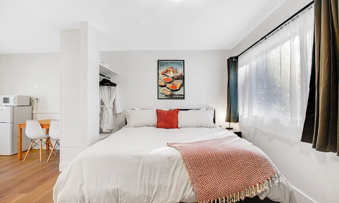 Welcome to your hiking vacation! The Mount Walker Inn is set right at the gateway to the Olympic Peninsula and the Hood Canal, making this a perfect retreat for hikers and those who want to explore the outdoors. Unwind in this comfortable ground floor studio, all set up with a modern, minimalist look. If you're coming back from adventures in the forest, just hang up your coat on the rack near the bathroom and step into a warm shower. The mini-fridge can store your restaurant leftovers and all your trail snacks, which you can then enjoy at the dining area. When you're done relaxing in the gazebo in the outside common space, enjoy a favorite TV show. Just pull the room-darkening shades closed when you're ready to drift off. High-speed WiFi and streaming (using guest accounts only) add convenience during your stay, while heating and air-conditioning offer ultimate comfort.