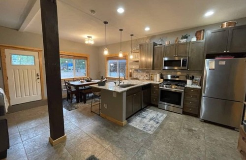 This is a 1,680 sq ft 2 story cabin with 4 queen beds (3 private bedrooms and 1 bed in an alcove off the upstairs living room). The mattresses are all new - there is a softer pillow top mattress from Macy's downstairs, two 12" Zinius memory foam mattresses purchased in 2021 upstairs and a 12" Iyee memory foam hybrid mattress with cooling gel purchased in 2021 in the small bedroom upstairs. There are 2 bathrooms, 2 living rooms, a game area, and a newly remodeled kitchen with bar and adjacent dining area. Enjoy cooking on the gas range in our fully equipped kitchen that comes with both a stove-top and electric griddle, Instapot, various pots, baking pans, salad spinner, measuring cups, serving platters, wine and champagne glasses, glass growlers, and matching white dishes. We also stock a number of spices, salt/pepper, olive oil, baking powder, baking soda, coffee filters, coffee for a few days, hot cocoa, apple cider and tea. The laundry room has a washer/dryer and plenty of hooks for wet clothes and towels. We provide detergent and dryer sheets. For kids we provide plastic dishes and utensils, a mobile high chair, pack n play, bathroom step stools, and a variety of toys from baby age to young adult games. A card table, board games, puzzles, cards, coloring books, crayons, and kids toys are in the game area cabinets upstairs. For doggos we provide large raised water and food bowls. The downstairs bathroom is newly remodeled and has a step up into the deep soaking tub/shower combo. Both showers are stocked with shampoo/conditioner and body wash. We provide hair dryers in both bathrooms and a first aid kit. Cuddle up with a book and one of our fuzzy blankets in front of the gas fireplace or enjoy Netflix or Hulu on two smart TVs. Free high speed wireless internet access.