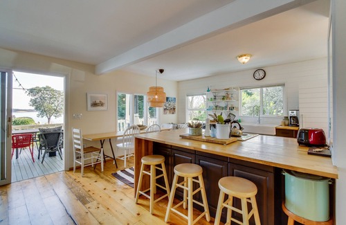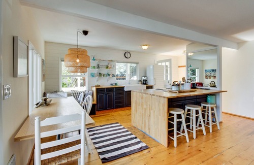 However you spend your days out, you'll love coming home to the shining bay views from this home's spacious deck. The living room also offers lovely views from its windows, so get nice and comfy near the wood stove and gaze out towards the sea. If you can bring yourself to rise from the cushy chairs, the kitchen comes equipped with all the tools you'll need to create delicious meals.