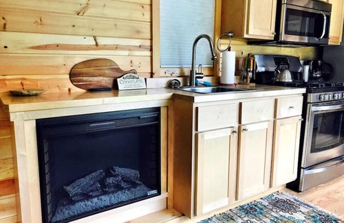 The house is very comfortable and modern with a cabin feel. It has a gas stove. Separate bedroom with nice queen mattress. TV with a dvd player and a number of classics the owner loves, no cable. Heated and cooled by a brand new Mitsubishi split system. A couch that folds down into a bed and a teeny tiny sleeping loft that has a firm full sized mattress. Tinyhouse is setup with self checkin. Recommended for two adults in bed and children on brand new leather futon sofabed. The loft bed is very very small (a full) and a very tight fit. Slept there once with 6’2 friend and we had to time our side turns and our faces were an inch from the ceiling.