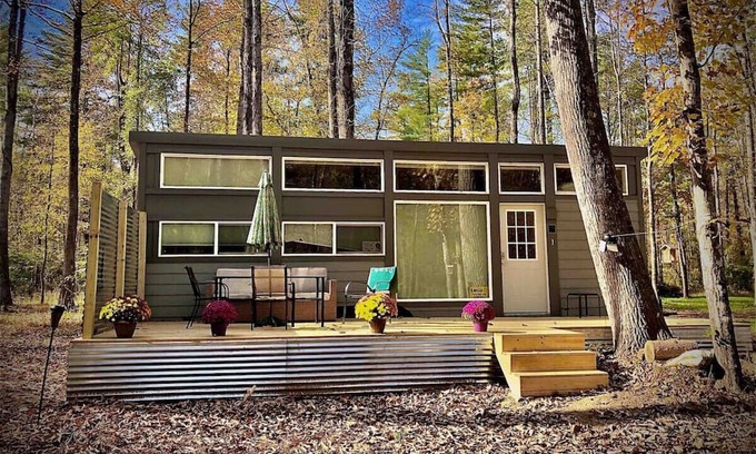 This is one of 3 tinyhouses at Lake James Tiny Houses GlampCamp. It is a small camp with a lot of heart put into it and the tiny houses curve around the river with a private outdoor space for each. Access to shared amenities including the european steam sauna, large firepit, kayaks, paddleboards and river access. The river connects directly to Lake James.