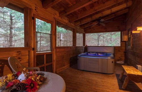Dogwood sits at the very top of the hill of our stays. You'll enter through the front porch, where you'll find a unique set of chairs to sit and take in the woods. Inside, you'll find an Indian theme of reds and browns. You'll be greeted by the sitting area and a gas log fireplace. On the other side is our fully equipped kitchen, off that is your bathroom. In the loft is your bedroom with a sturdy queen size bed. Out the back is a screened in porch with your own private hot tub.