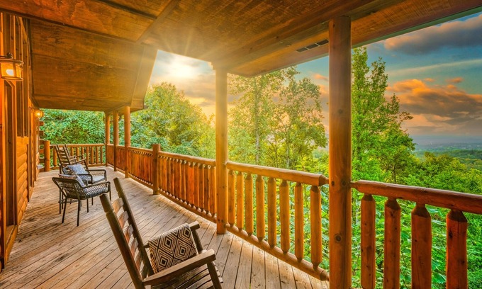 ⭐️ Relax on the rocking chairs on the two outdoor decks or soak in the hot tub (which is cleaned after every guest) while enjoying the serene natural beauty of the mountains and the spectacular sunset.