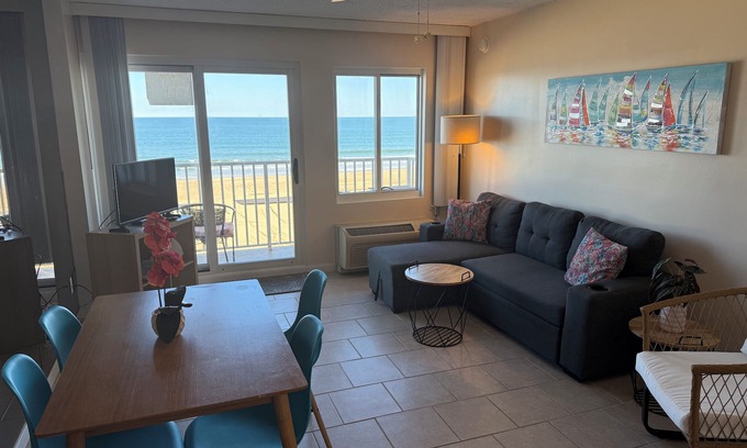 Dolphin Beach condo with spectacular views of the ocean from every room. It is a 2 bed/2 bath condo with a balcony. The condo is conveniently located close to the local restaurants and the exciting Virginia beach boardwalk/resort area. Steps from the beach. An indoor pool and rooftop are available.