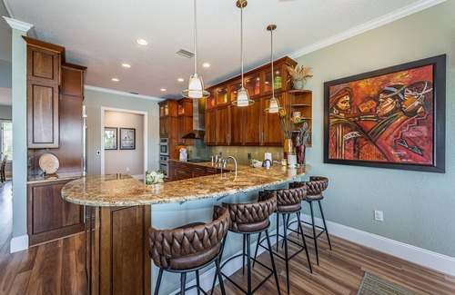 Our custom home has been decorated with the comforts of home in mind. You'll find many unique features including a hearty wood burning fireplace for chilly winter evenings. The master king suite is extremely spacious and the luxury ensuite boasts a large soaking tub, double shower heads, rain shower and dual towel heaters. The additional three bedrooms are bright, cheerful and comfortable with easy going beach decor and colors. The spacious kitchen is the heart of the home and features expansive granite counters, high end appliances and a full selection of oils, seasonings and spices for you to prepare your favorite meals and enjoy good times with family and friends.