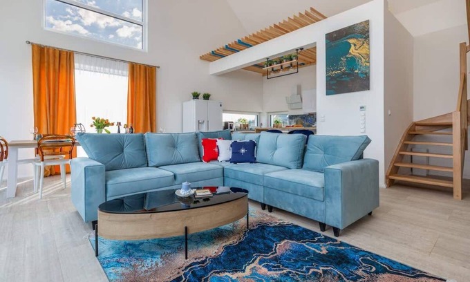 This spacious house covers an area of 230 square meters and can comfortably accommodate up to 8 people - so it is an ideal offer for groups of friends or large families! The house has four bedrooms (three with double beds, one with 2 single beds), three bathrooms (in addition, one of the bedrooms has a round bathtub), a living room, a terrace, a balcony, a kitchen area and a laundry room. In addition, the house includes a yard with garden furniture, playground, sauna and jacuzzi - a perfect place to relax on warm evenings. The kitchen is equipped with the necessary equipment that allows you to prepare tasty meals. Stylish accessories and fashionable patterns are the reason of unique atmosphere of this house. Modern amenities designed for guests' use, such as high-speed WiFi, five flat-screen TVs, underfloor heating, sauna and jacuzzi will make rest in this place a real pleasure. For guests arriving by their own car, parking spaces are provided on the property, as well as in front of the gate.