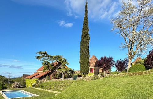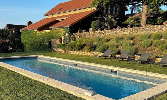 Guest accommodations at Domaine Avec Hangar à Tabac Idéal Pour Familles et Amis offer private pools and fireplaces. Rooms open to patios. Kitchens offer refrigerators, stovetops, microwaves, and separate dining areas. Bathrooms include showers and hair dryers.