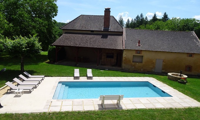 Come and discover in Milhac this large property and its two outbuildings with heated swimming pool, wifi, a very large shaded garden, garden furniture, deck chairs and private parking.