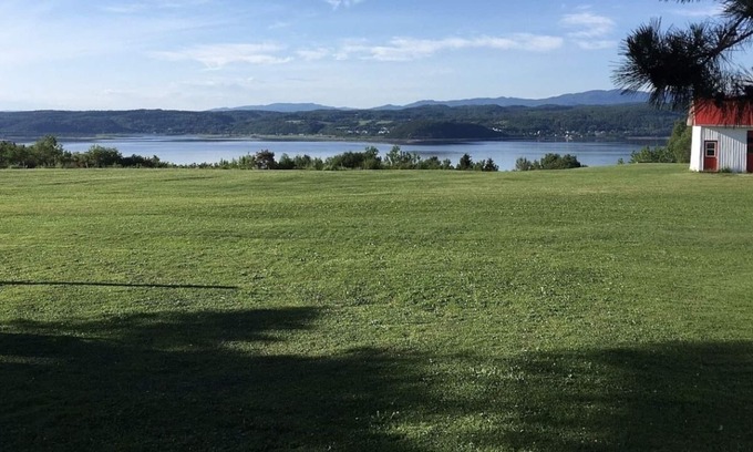 La maison est située à La Baie, sur un terrain privé de 17 acres de champ et de forêt avec une vue imprenable sur la rivière. Vous avez accès à une plage privée de 160 mètres de largeur via un sentier.