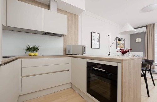 The building is located in a business district and is well connected to the rest of the city. This makes it a great place to relax for those who like to spend their leisure time in an active and varied way. Friends traveling together can come here, as well as couples or parents with children. It takes only 10 minutes to get to the airport by car, and the railway station is 11 minutes' walk away. The nearest public transportation stop can be reached in just 2 minutes. Motorized guests will find a parking space located in the underground garage, which also houses bicycle racks. The property also has a sauna, billiards and a gym in the common area of the property. Lovers of outdoor activities and regular workouts can reach the outdoor gym in a few minutes. The car route to the shooting range, bowling alley, swimming pool and tennis court takes only 11-13 minutes. A Żabka grocery store is located in the building, so visitors can conveniently stock up on groceries. On the other hand, the Westfield Mokotów shopping center can be reached in less than a quarter of an hour. There is also no shortage of restaurants and cafes nearby - establishments such as Culture Cafe, Bistro na budowie and Posmakuj can be reached on foot in just 2-12 minutes.