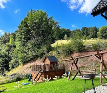 Domek u Beaty offers accommodations in Kudowa-Zdrój, 3.5 miles from Aqua Park Kudowa and 7.6 miles from Chopin Manor. Housed in a building dating from 2017, this vacation home is 2 miles from Kudowa Zdrój Train Station and 13 miles from Polanica Zdroj Train Station. There's an outdoor fireplace and guests can use free Wifi and free private parking. Providing a terrace and mountain views, the vacation home includes 3 bedrooms, a living room, satellite flat-screen TV, an equipped kitchen, and 2 bathrooms with a shower. The parquet floors, fireplace, and peaceful vibe add to the ambience of the room. This vacation home is allergy-free and non-smoking. For guests with children, the vacation home provides a children's playground. There is a garden with a barbecue at this property, and guests can go skiing nearby. Polanica Zdrój Mineral Water Pump Room is 13 miles from Domek u Beaty, while Chess Park is 14 miles away.