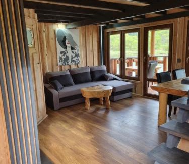 Domki nad Sanem in Lesko provides accommodations with a garden and barbecue facilities. This property offers access to table tennis, darts, and free private parking. The vacation home features an outdoor fireplace and a 24-hour front desk. The vacation home provides guests with a terrace, river views, a seating area, a flat-screen TV, a fully equipped kitchenette with a fridge and a stovetop, and a private bathroom with shower. A patio with an outdoor dining area and garden views is offered in all units. The rooms are equipped with heating facilities. For guests with children, Domki nad Sanem offers a children's playground. Skiing, cycling, and hiking are possible within the area, and the accommodation offers ski storage space. Skansen Sanok is 8.8 miles from Domki nad Sanem, while Zdzislaw Beksinski Gallery is 8.8 miles from the property. The nearest airport is Rzeszów-Jasionka Airport, 60 miles from the vacation home.