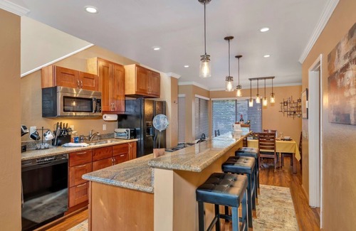 As you enter the 2nd floor floor (main level) of our amazing condo you will find our living room and dining area tastefully furnished and decorated with owner picked art. Our kitchen has gleaming new granite countertops, electric stove/oven, dishwasher, refrigerator, toaster oven, microwave &12 cup coffee pot + coffee pod making as well (starter pods interluded). Kitchen is fully equipped with spices, pots & pans, cookware, utensils, everything you will need to make your perfect dish + bistro bar with granite countertops with 4 bar stools for additional and casual seating. Starter supply of dishwasher soap, hand soap, 1 new sponge, dish detergent & 1 roll of paper towels included. Dining table seats 6 + kitchen island seats 4 with bar stools.
