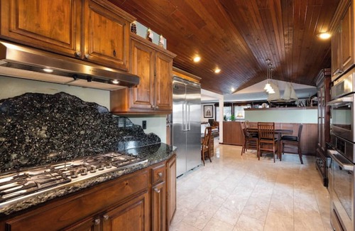 Three levels of living. Upstairs offers the kitchen featuring a double oven with steamer, a five-burner gas range, and a Viking refrigerator. There is a dining area off the kitchen with a wine refrigerator. The cozy living room offers a gas fireplace capable of heating the whole house. There is a tiled steam room with his and her shower heads. One bedroom with a king bed, a smart TV and a balcony overseeing the yard and pool.