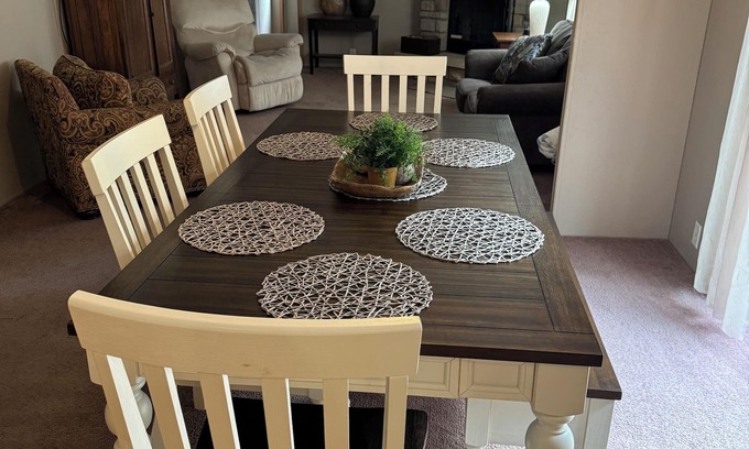 A beautiful home with flat screen TV's in every room ( 4 smart TV’s) central air, new furniture, stocked kitchen, coffee station with coffee creamer and sugar, fire pit, grill with charcoal and decorated nicely!!