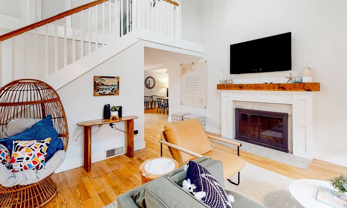 After a day full of adventure, the bright interior of your stay will welcome you with open arms. Showcasing warm wood flooring and high ceilings, the living room comes complete with a gas fireplace, a large TV, and ample seating. When you aren't hanging out here, head for the home's expansive outdoor living space! Spend your afternoons splashing in the pool's turquoise water, or catching up with your loved ones on the covered deck.