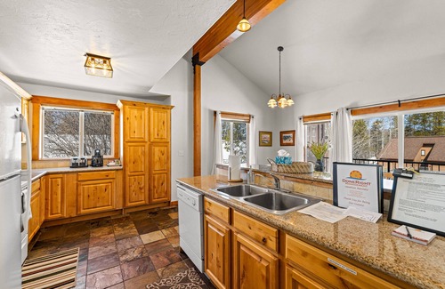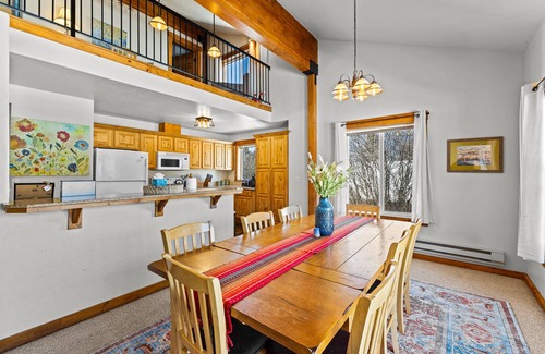 The master bedroom on the main floor features an ensuite bathroom and walk-in closet, king size bed, desk, and television. The second bedroom, with a queen-size bed, is also on the main floor and adjacent to the guest bathroom. Upstairs is an open loft TV room with a Roku TV and DVD player, a sofa sleeper, plus an additional room with bunk bed. The living area downstairs features a wood stove in the living room, a small balcony, and a large dining room table that accommodates all your guests. Parking for guests is in a one-car garage below the condo as well as additional parking for one car in front of the garage. The unit is fully equipped with Wi-Fi and has a full-sized washer and dryer.