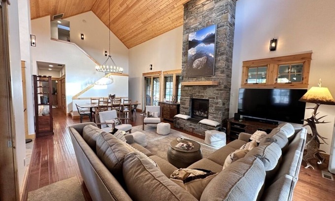 Step into a peaceful, beautifully furnished home. A stone fireplace anchors the living room and the kitchen. A wrap-around covered deck will have you enjoying as many meals outside as you can, among the greenery of the landscaping, and includes an outdoor fireplace, private hot tub, dining table, and several different seating options. This home sits on a large lot ideal for socializing and playing yard games.