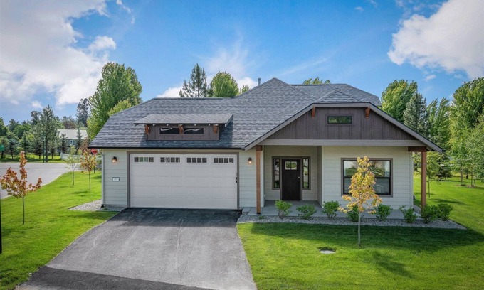 Upon entering, you are immediately welcomed by the modern and open floor plan. Beautiful LVP wood floors, tall ceilings, a fabulous and fully appointed kitchen, laundry, plus three bedrooms and large garage, complete the main level. The kitchen is a cook's dream as they’ll enjoy new appliances, plenty of cabinet space, quartz countertops and the massive island which doubles as additional counter seating. Tall windows let in plenty of light and the kitchen opens up to a dining and living room area, plus a covered deck for al fresco dining. The Master bedroom is ensuite with King bed and walk in spacious closet, while the second bedroom has a Queen bed and a third bedroom has a Twin over Full bunk - ALL with luxury linens. Off the living room, stairs lead up to a bonus room with sleeper sofa, additional TV and custom desk (super high speed internet of course too!). This home is fully appointed with thoughtful details and a large two car garage too!