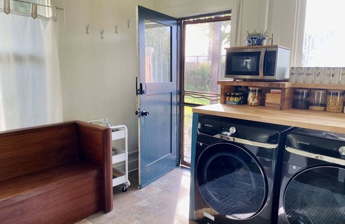 Enter into the charming, well-stocked kitchen, where you will find everything you need for a delightful stay. Whether you plan to cook a lot or just want to enjoy our fantastic selection of teas, coffee, and treats, we've got you covered. The full kitchen also includes a washer-dryer, which you will be welcome to use (laundry detergent included).