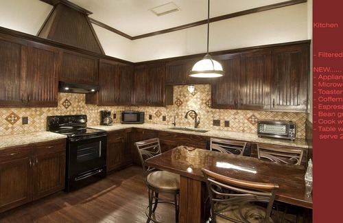 Kitchen – Spacious – - table seats 4, New dishes, cups, glasses, silverware, coffee and espresso + bean grinder. Filtered water in the kitchen.